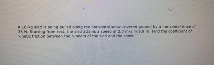 Starting from rest the sled attains a speed of 20 ms in 80 m. Find the coefficient of kinetic friction between the runners of the sled and the snow. A 16-kg sled is being pulled along the horizontal snow-covered ground by a horizontal force of 24 N.